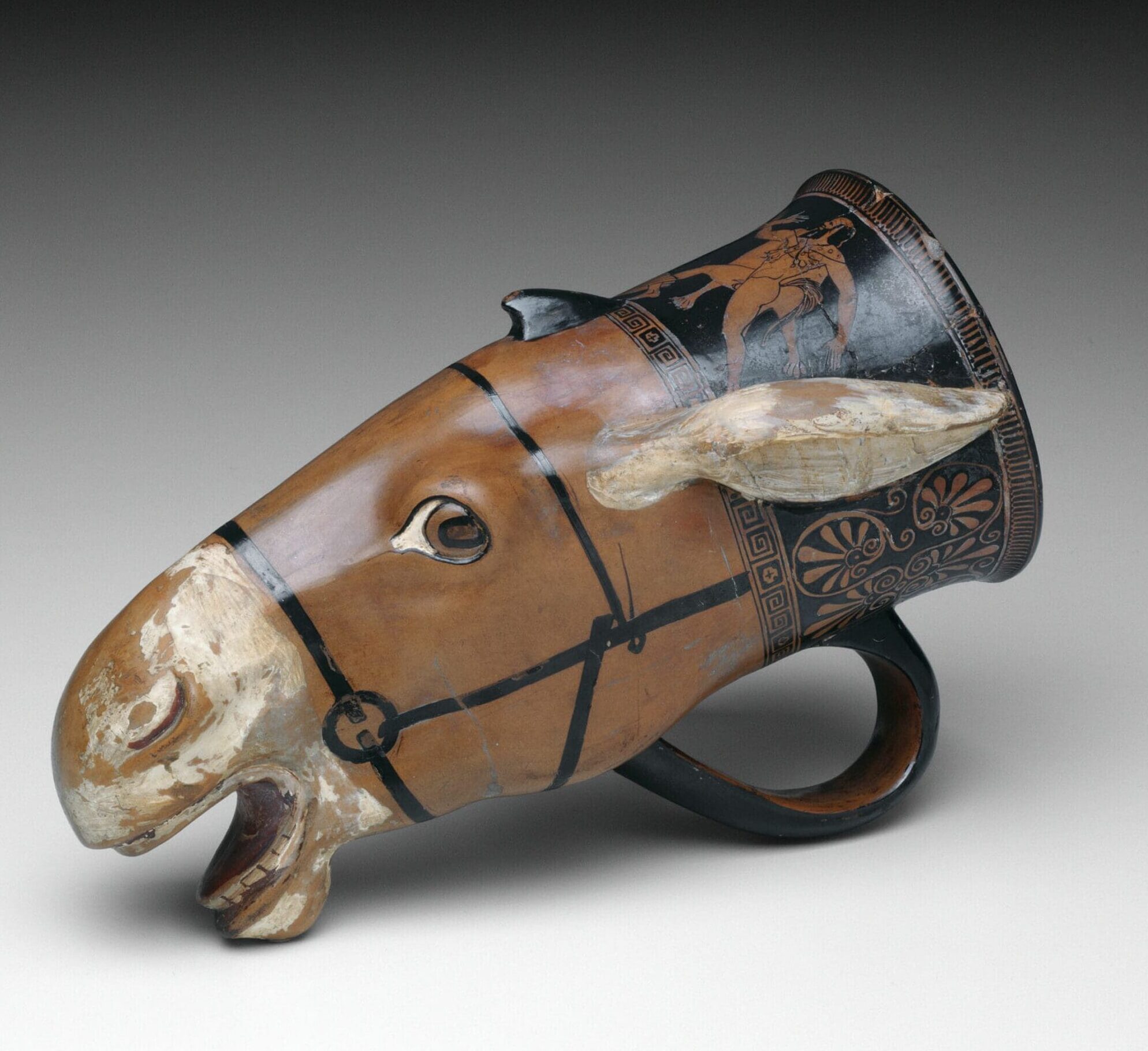 Terracotta rhyton (drinking vessel) in the shape of a donkey head, Greek, c. 480–470 BCE. CC0 Public Domain, via The Art Institute of Chicago.