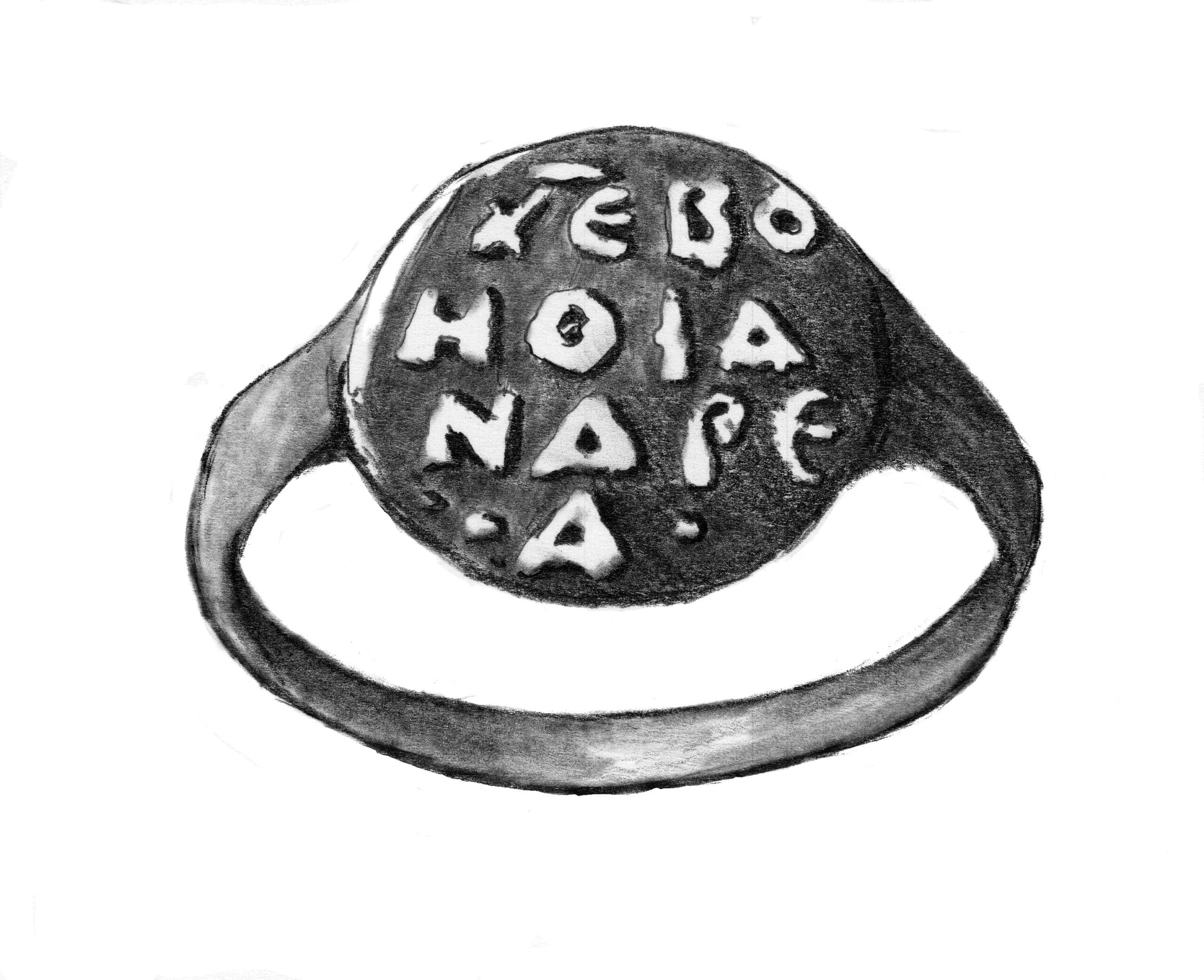 Another example of small Christian amulets is a brass ring discovered at Hammat Gader in the southern Golan (see image above). The entire surface area of this small amulet is covered with this Greek inscription: “Christ, help Andreas.” Although we cannot know the identity of the said Andreas, we understand that he wore the ring for protection. Interestingly, its text is distinctly Christian—a form of prayer. This prayer would have been unremarkable to any early Christian and it would have solicited only praise from religious leaders. Yet John Chrysostom makes it clear that even such rings as material objects were not permitted for good Christians.