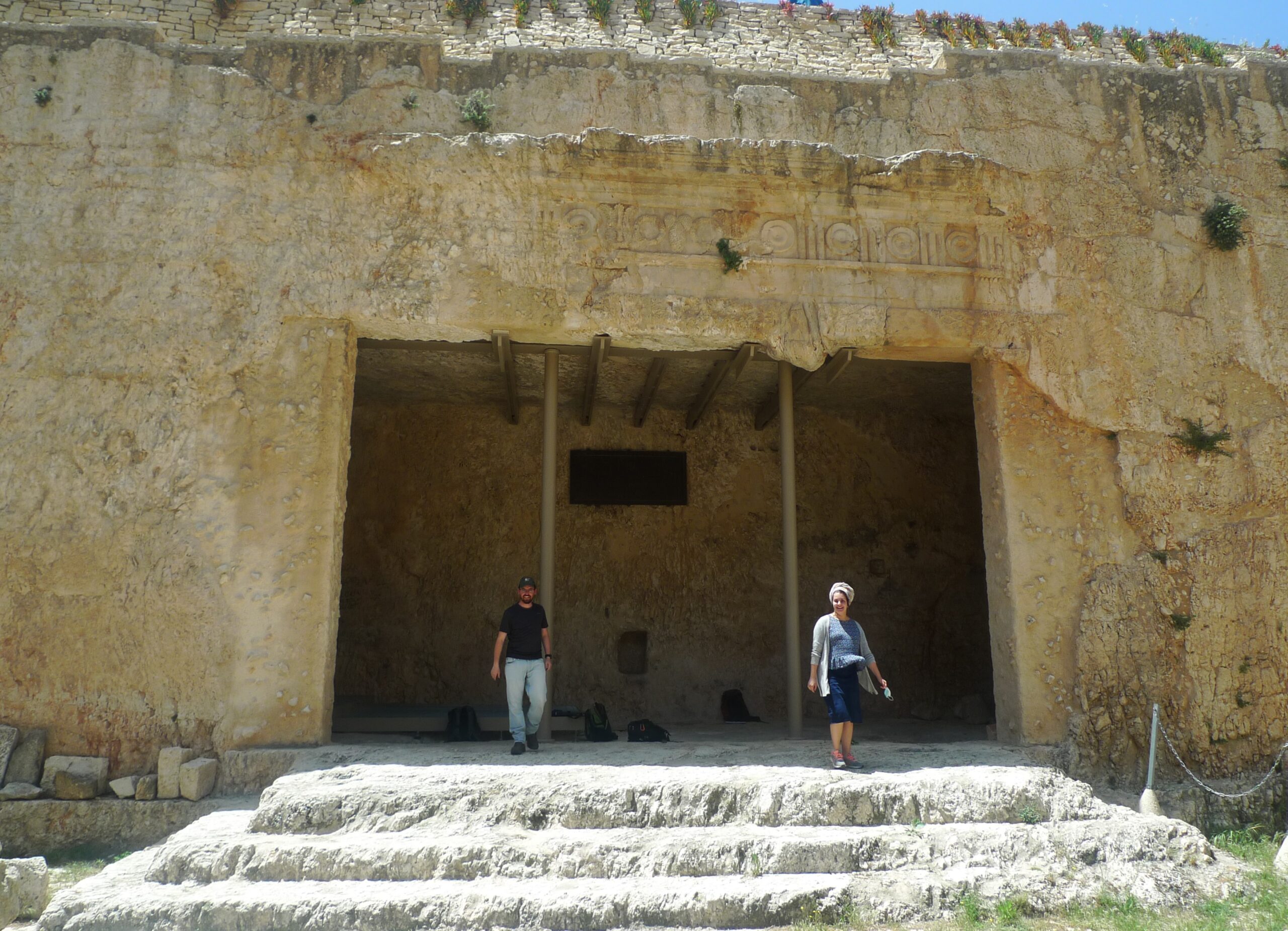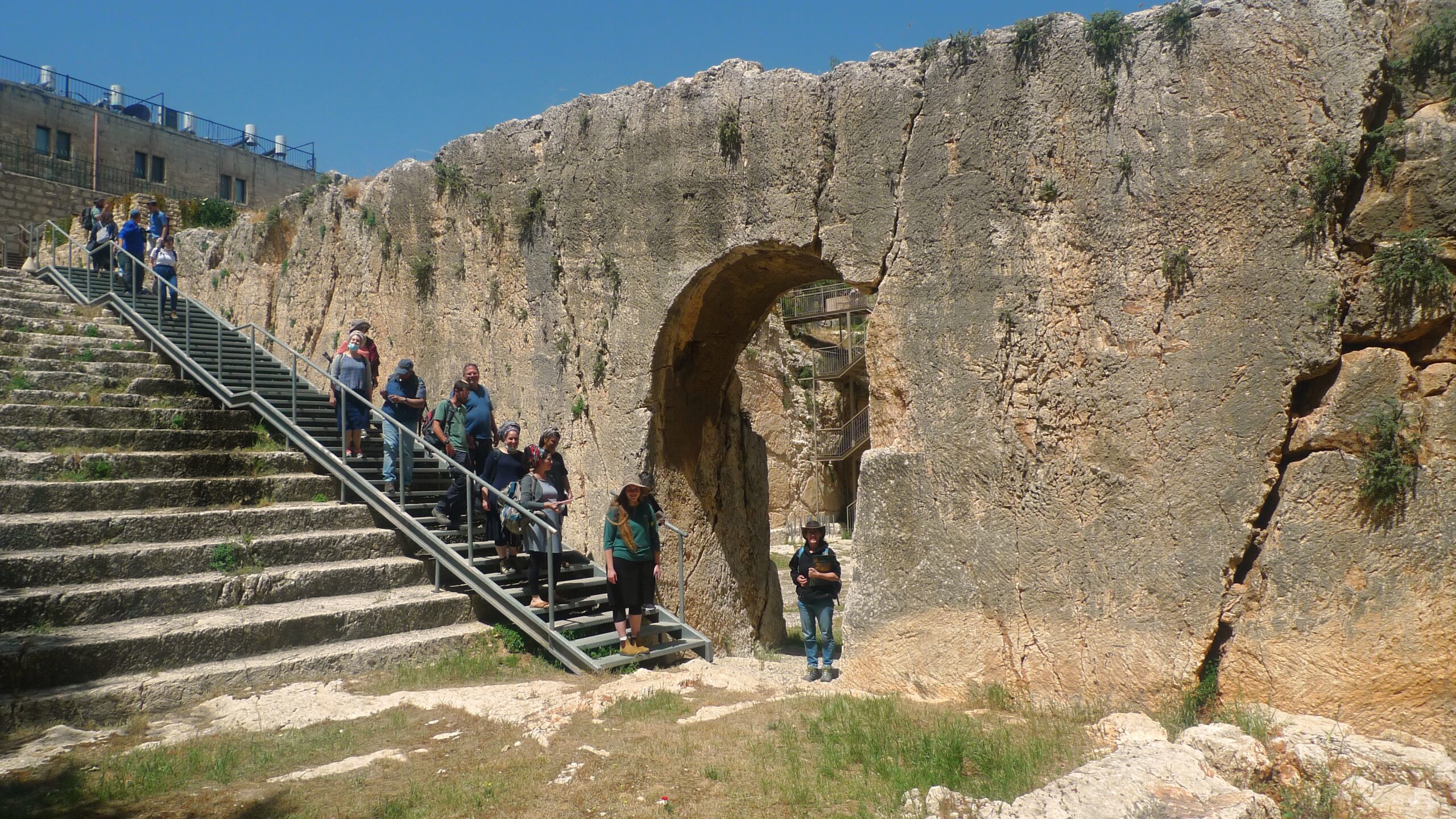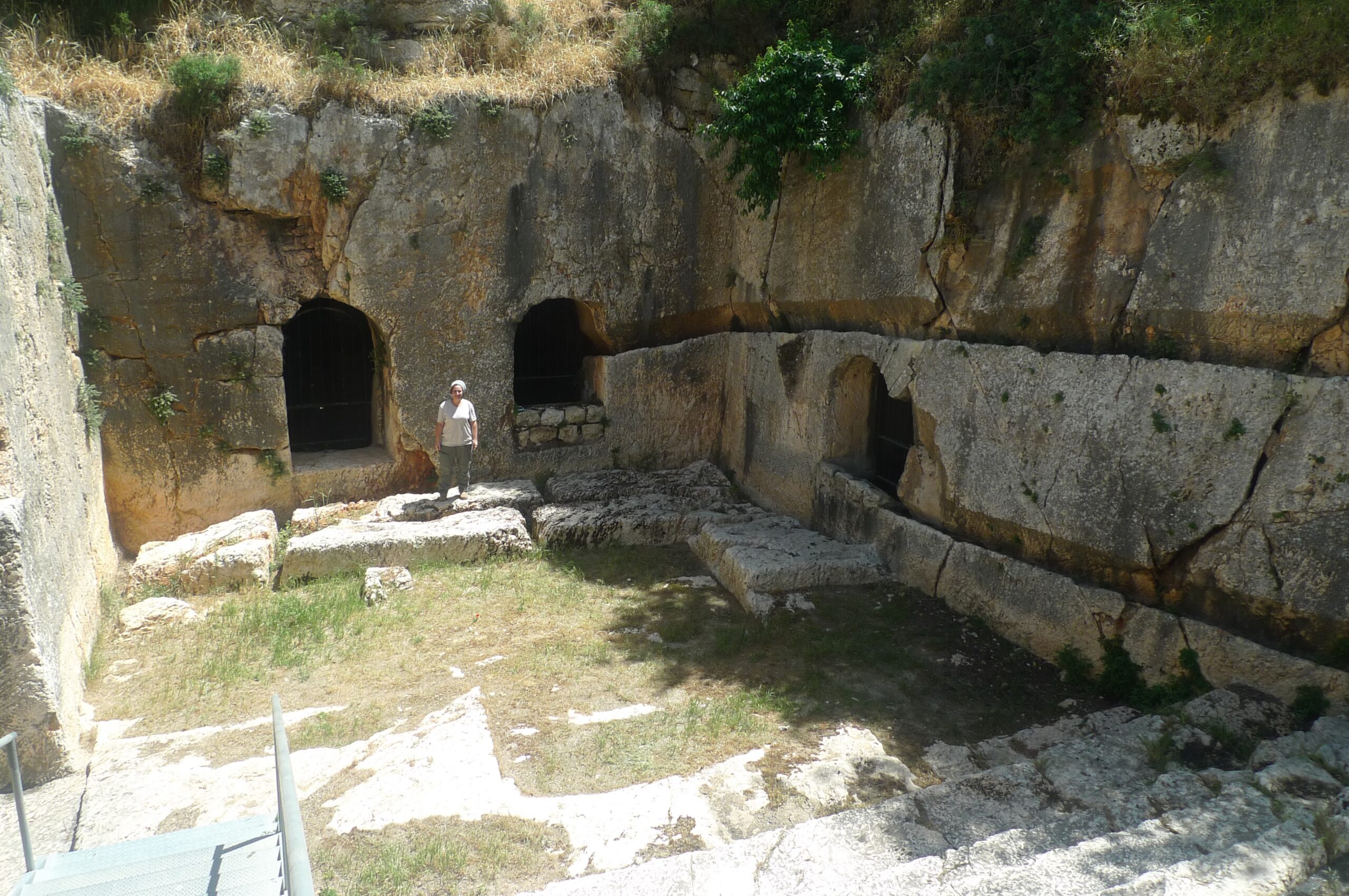 The entrance area is a wide, rectangular corridor leading from an entrance gate, which has not survived, to a rock-cut plaza via a monumental staircase. The staircase consists of alternating steps with shallow and deep treads. These steps resemble the ones unearthed in the stepped street in the City of David and in the Southern Wall Plaza. Another example has been found at the entrance to the Cave of Jehoshaphat, which is next to the monument known as Absalom’s Pillar. All of these examples are associated with rituals and the Temple. At the bottom of the staircase, there are two entrances to ritual baths (one straight ahead, the other to the right) and a gate leading to the tomb courtyard located on the northern side to the left. The gate has an arched lintel and measures almost 15 feet tall and 10 feet wide.