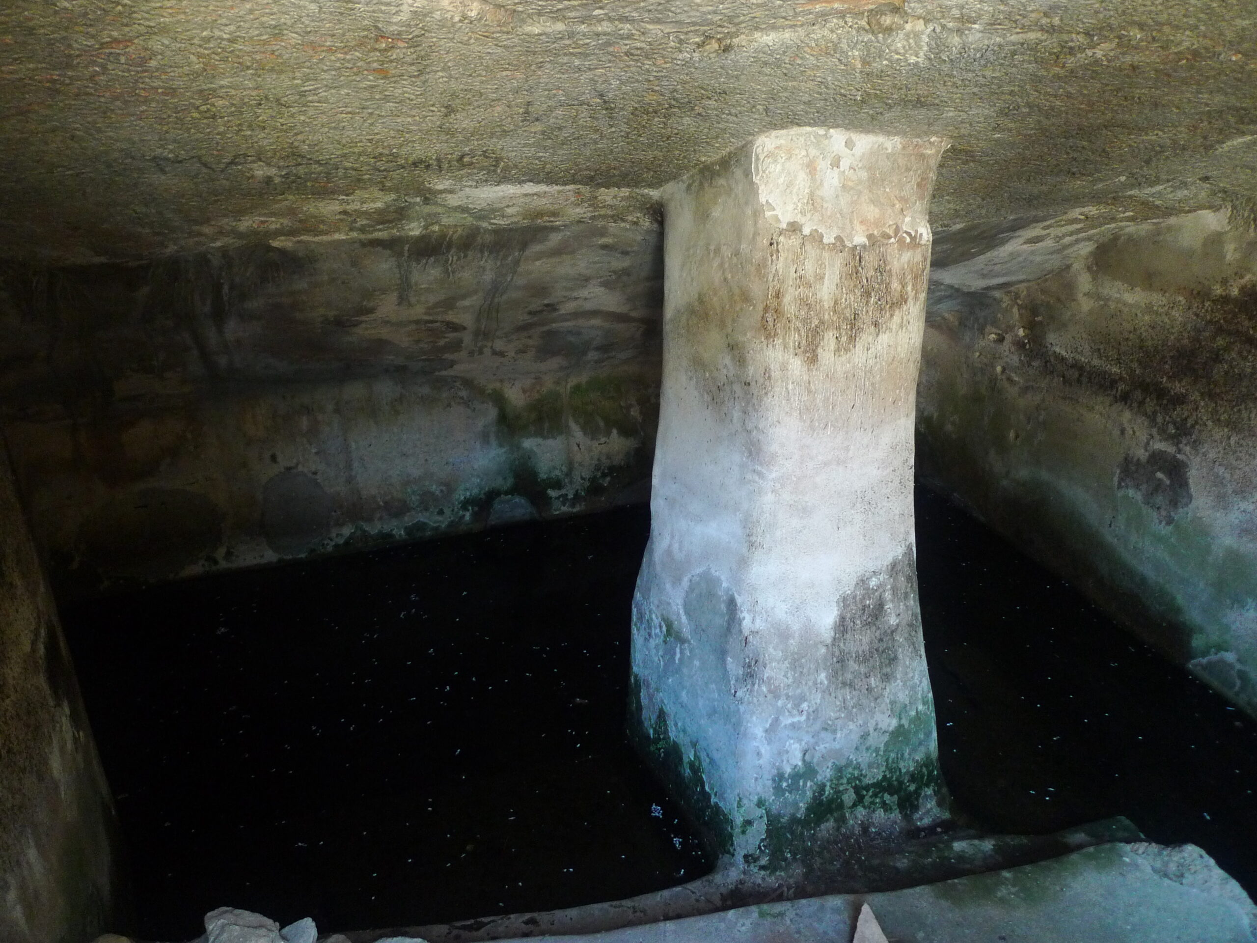 At the bottom of the monumental staircase, two large ritual baths were carved out of the bedrock. Entered via rock-cut, vaulted openings, the eastern bath (B, located opposite the staircase) has a double entrance; the southern bath (A, to the right of the staircase) has only a single entrance. Inside, Bath B is divided by a rock-cut pillar, which also serves as a supporting column. Each bath has a staircase descending to the bottom that consists of two narrow-tread steps of standard height alternating with a relatively high step with a deep tread. At the bottom of each staircase, a small step in the corner of the floor makes it easier to walk down. The installations were coated with hydraulic plaster and fed with rainwater via two large channels carved out of the southern wall of the compound.