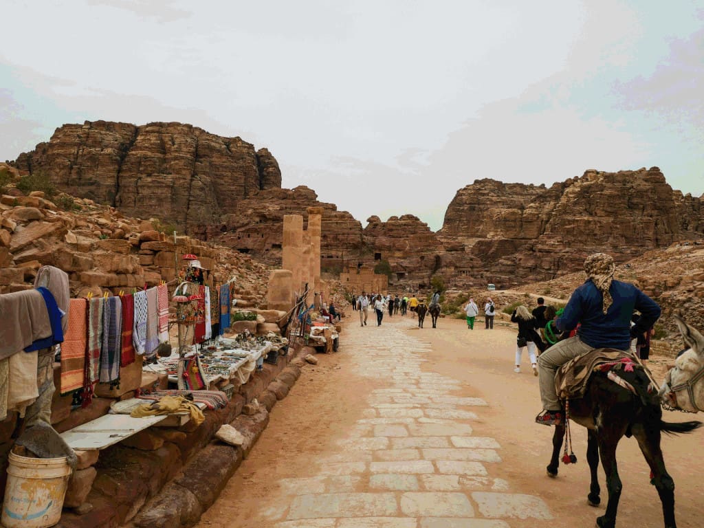 Beyond the Siq and the Khazneh are the remains of the thriving Hellenistic city. Among the city’s marvels was an impressive theater. Carved out of the rock, the theater could have held upwards of 6,000 people. Further along the path is the city’s colonnaded street: a wide, half-mile-long, stone-paved thoroughfare flanked on all sides by the key institutions of the city’s Hellenistic life. On the left, one can spot the remnants of luxurious pools and gardens, as well as a bustling market and a grand audience hall reached by a monumental staircase; to the right, there is an elegant nymphaeum and an opulent shrine, the so-called Temple of the Winged Lions, dedicated to al-Uzza, thought to be the chief goddesses of the Nabateans.