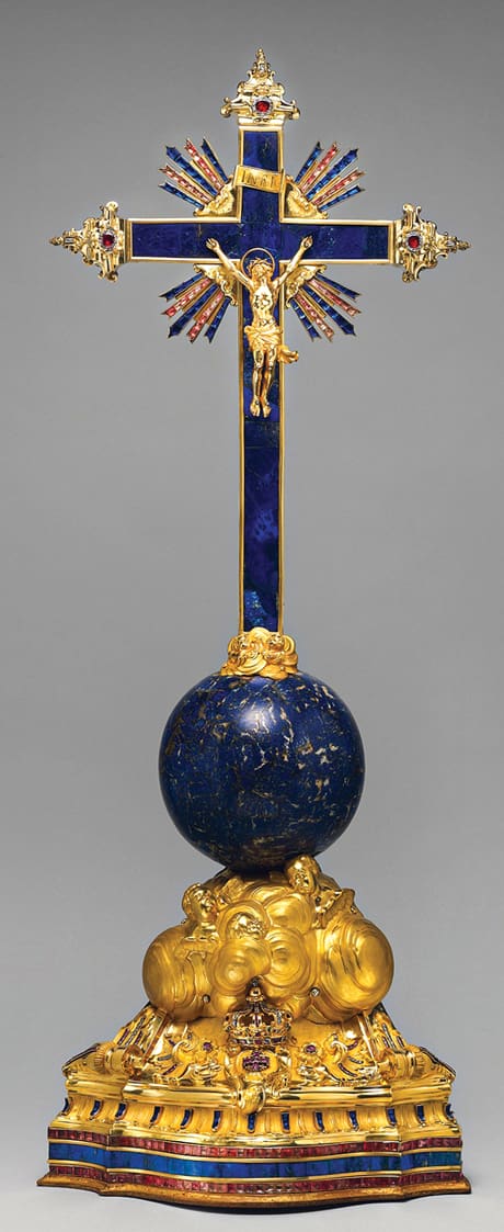 Among the masterpieces on display is this crucifix from mid-18th-century Italy. It is made of gold and lapis lazuli and lavishly decorated with diamonds, emeralds, garnets, quartzes, rubies, and glass.